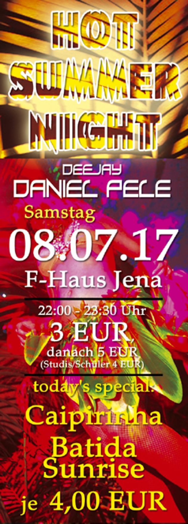 Geschrieben am 02. Dezember 2016. Veröffentlicht in K2-Kategorie Veranstaltungen. Hot Summer Night - Sommernachtsdiscoparty mit DJ Daniel Pélé und Cocktail-Specials - 08. Juli 2017 F-Haus Jena weitere Infos ..... Aufrufe: 397 Zurück Weiter