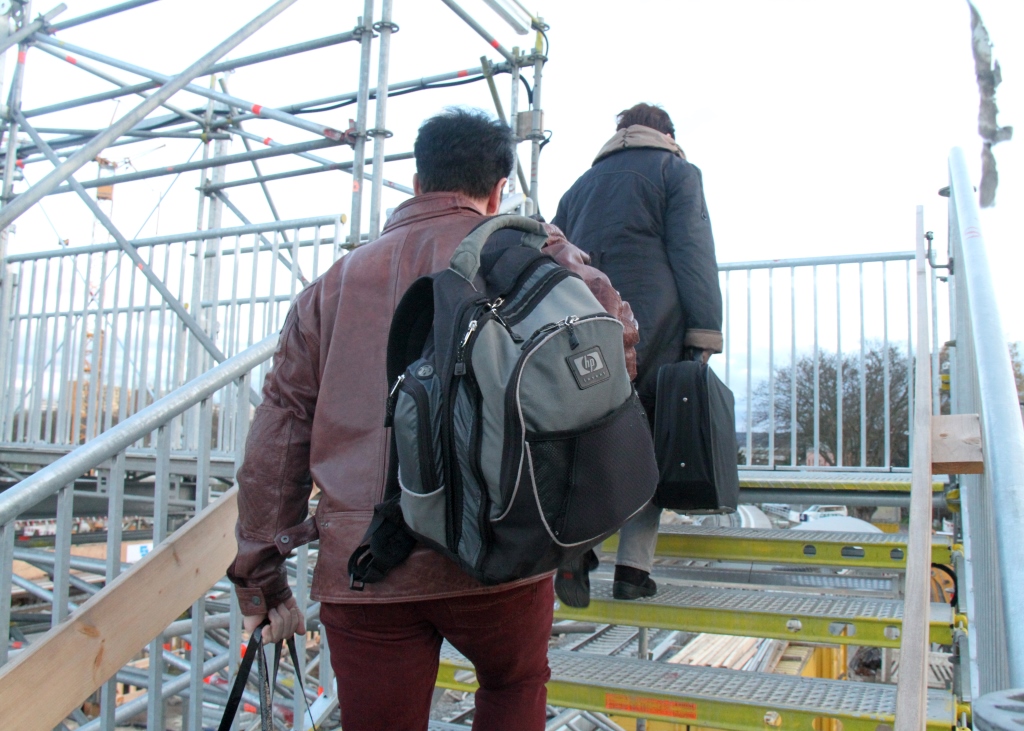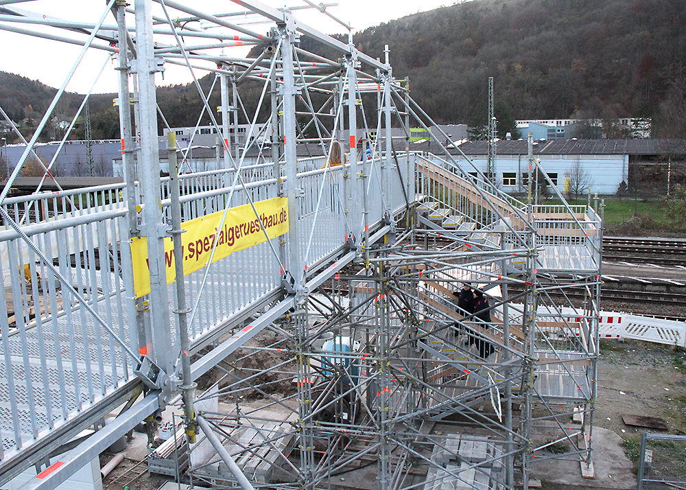 Wie wir am Sonntag beim ankommenden Zug aus Rudolstadt beobachten konnten, hangeln sich einige Reisende eher über die Brücke als zu laufen. Da die Konstruktion provisorisch ist und deswegen durchsehbar und etwas wackelig daherkommt, müssen sich auch Menschen mit Höhenangst erst einmal überwinden, in dieser Höhe über die Schienen zu laufen.