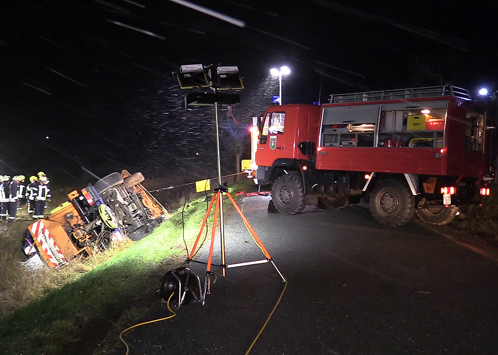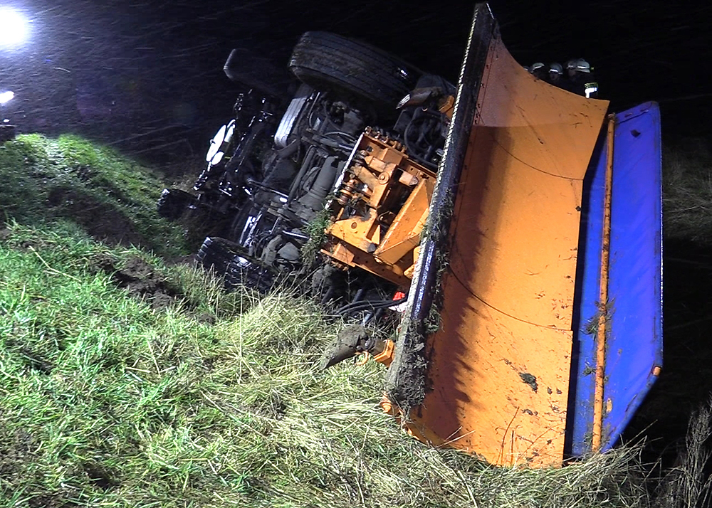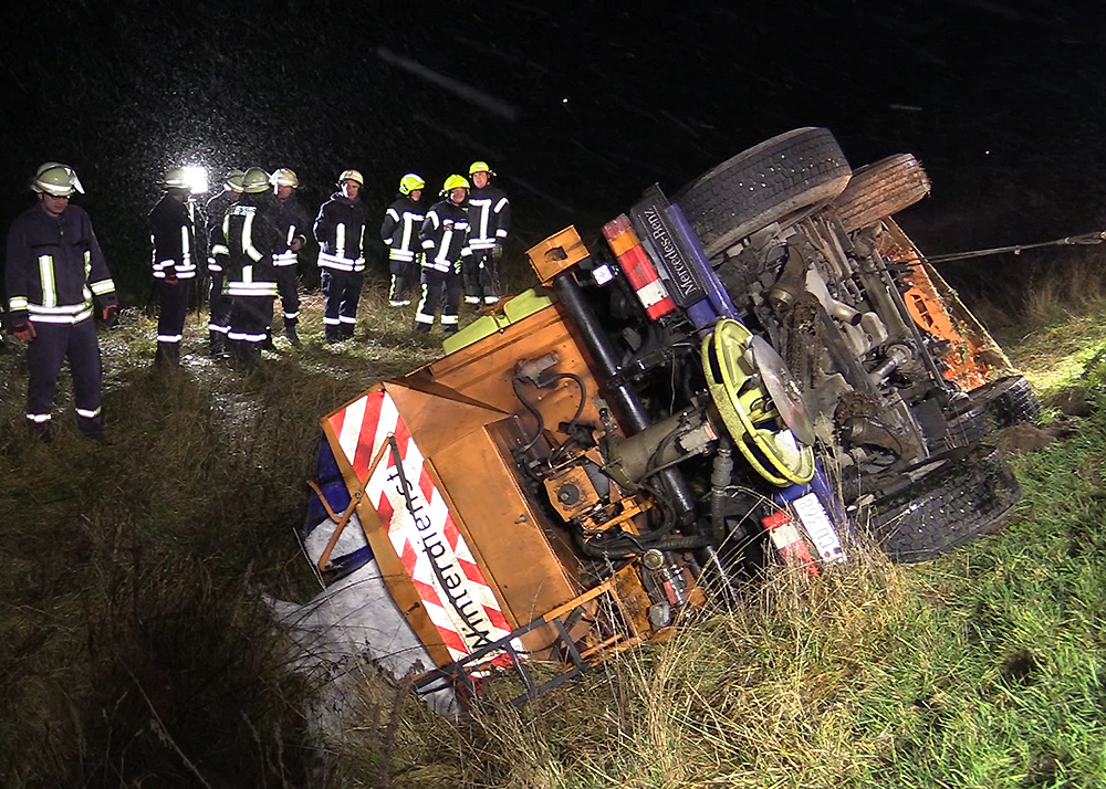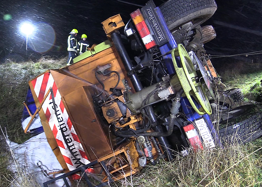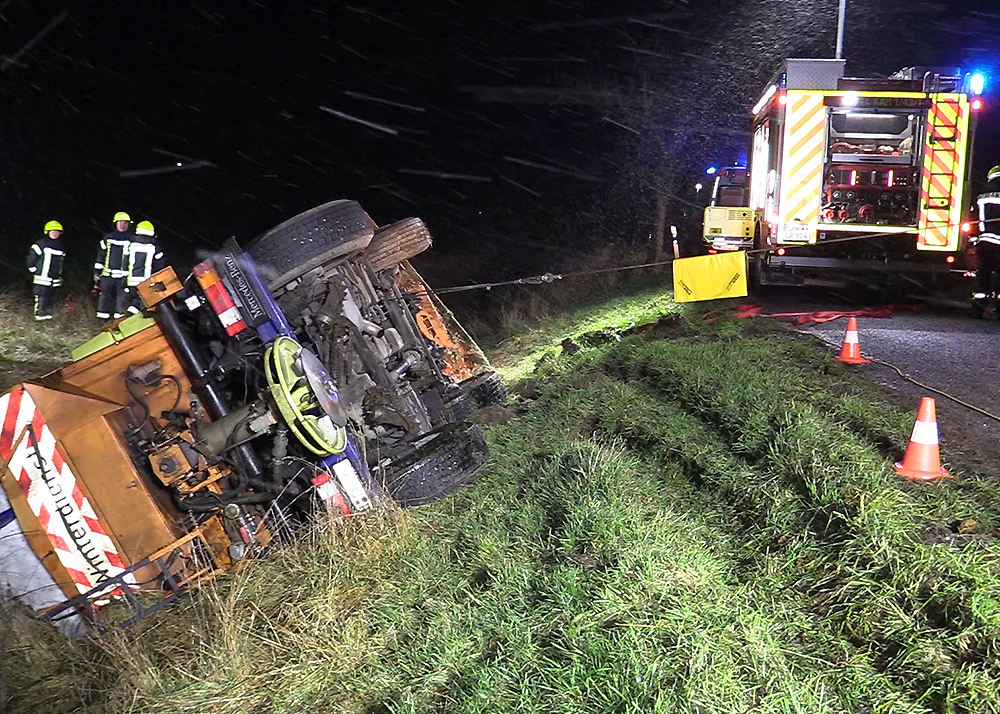 Zu einem schweren Unfall mit einem Fahrzeug des Winterdienstes kam es am frühen Mittwochmorgen im Schneetreiben zwischen Gumperda und Röttelmisch bei Kahla. Foto: Fabian Peikow