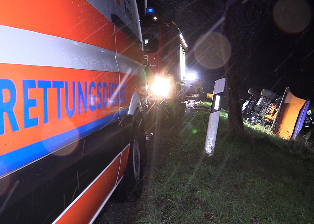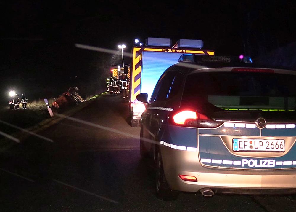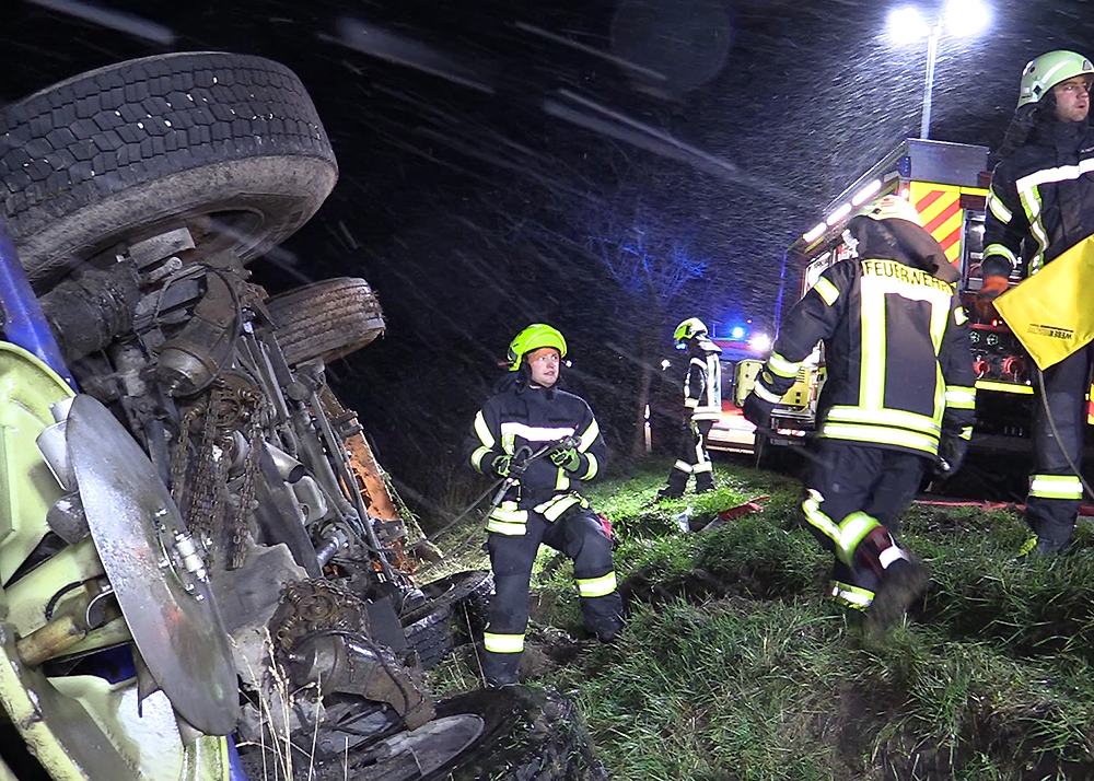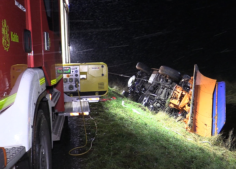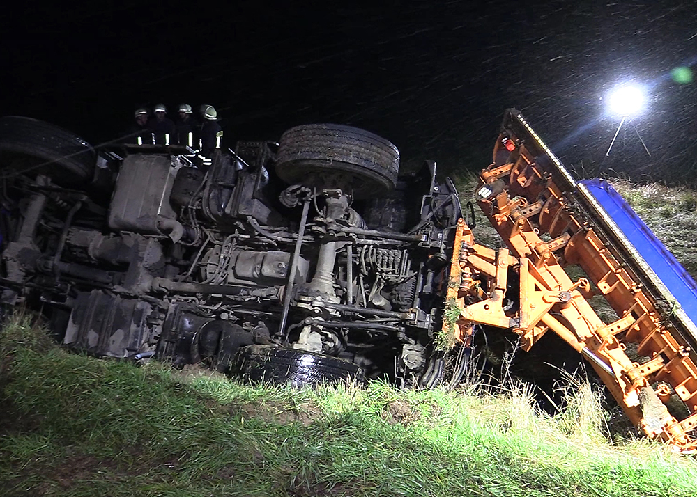 Zu einem schweren Unfall mit einem Fahrzeug des Winterdienstes kam es am frühen Mittwochmorgen im Schneetreiben zwischen Gumperda und Röttelmisch bei Kahla. Foto: Fabian Peikow