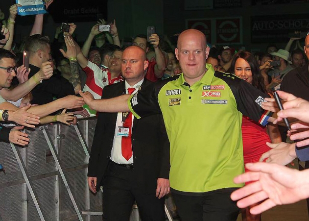 Die derzeitige Nummer 1 der Darts-Welt, Michael van Gerwen gewinnt am Freitagabend die Darts-Gala in Jena. 3.201 Euro an die Aktion „Wünschewagen“ des ASB überreicht. Fotos: Steffen Langbein