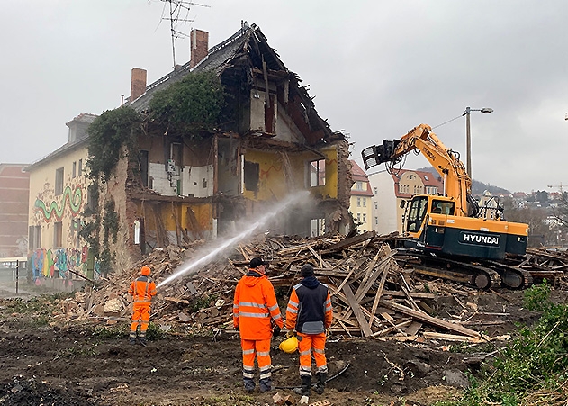 Begleitet von einer Abrissparty der ehemaligen Bewohner und Sympathisanten wurde am Dienstagvormittag begonnen das Haus am Inselplatz 9a in Jena abzureißen. Fotos: © Jenaer Nachrichten