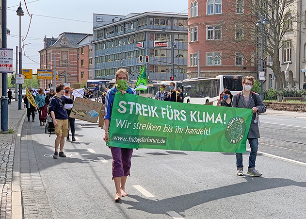 5. Globaler Klimastreik: Die neuen Corona-Lockerungen machten es möglich, dass am Freitagmittag 50 Aktivisten von Fridays for Future mit einem Demozug durch die Jenaer Innenstadt ziehen konnten.