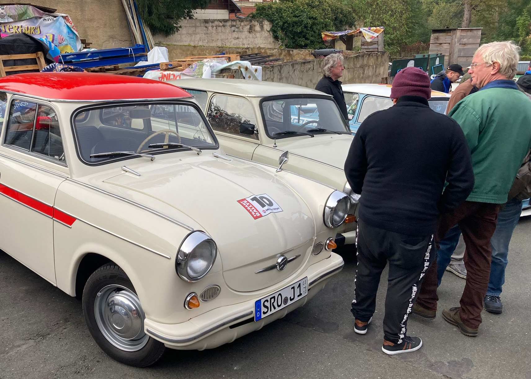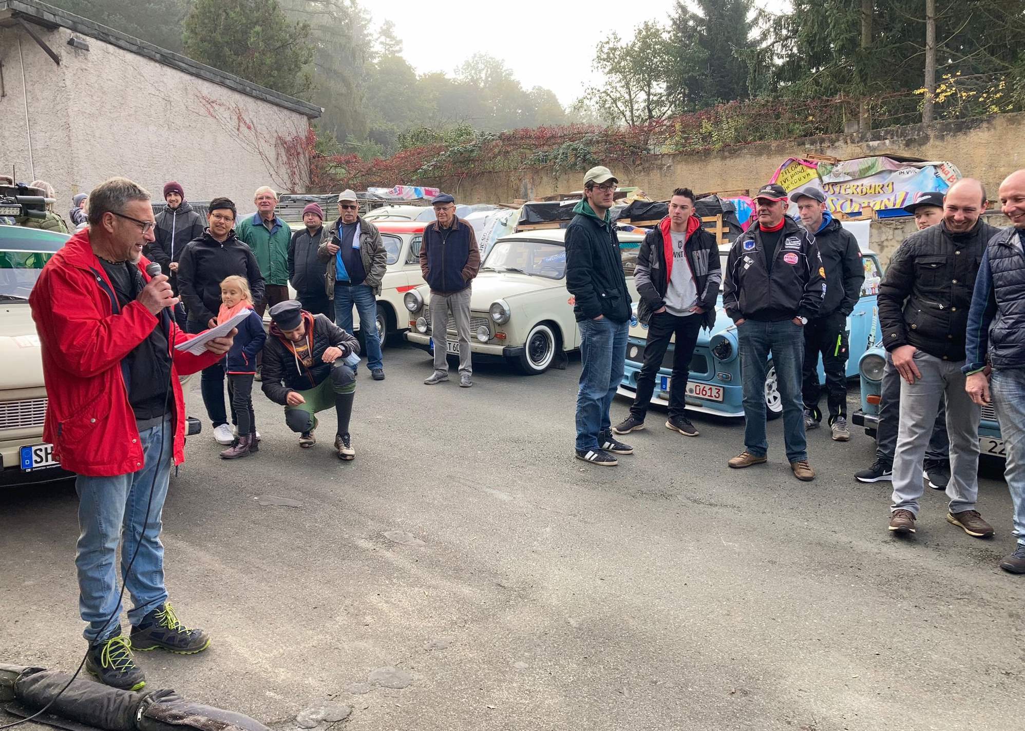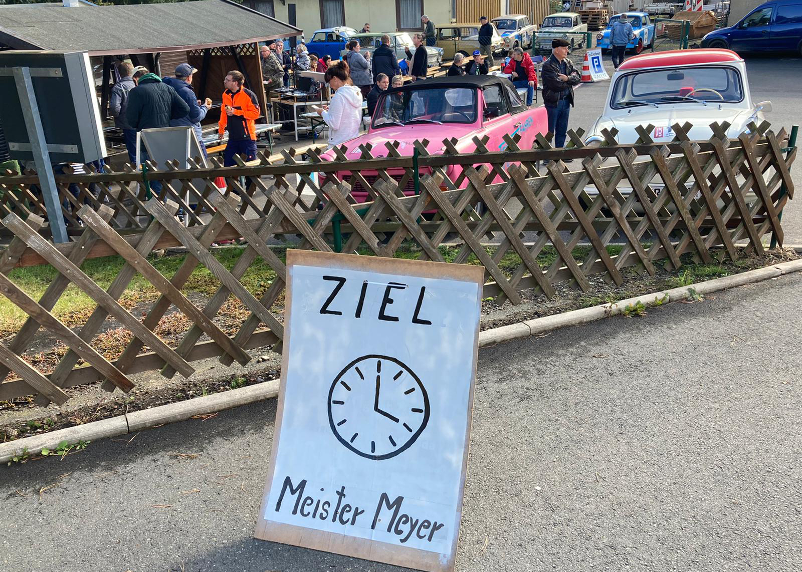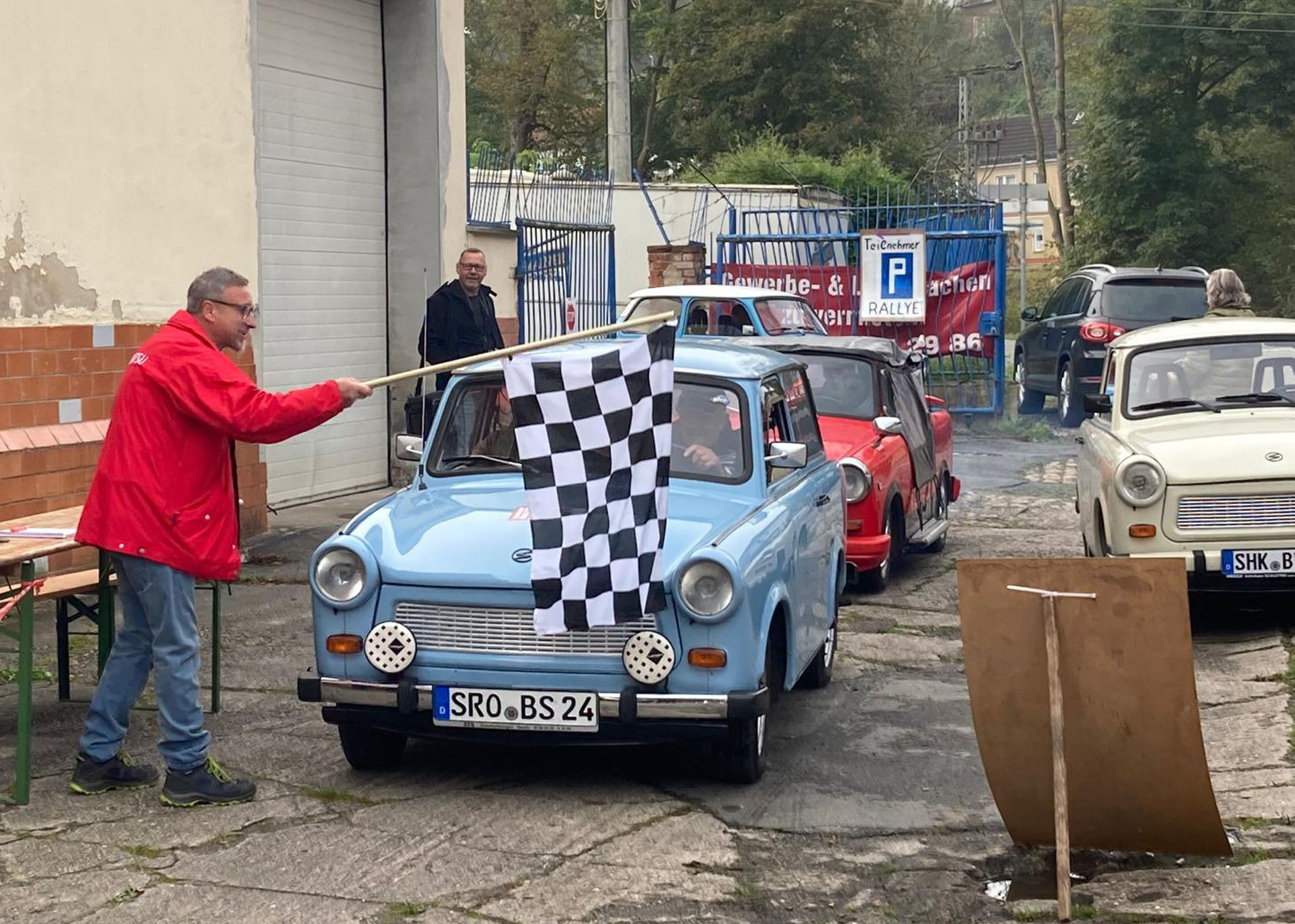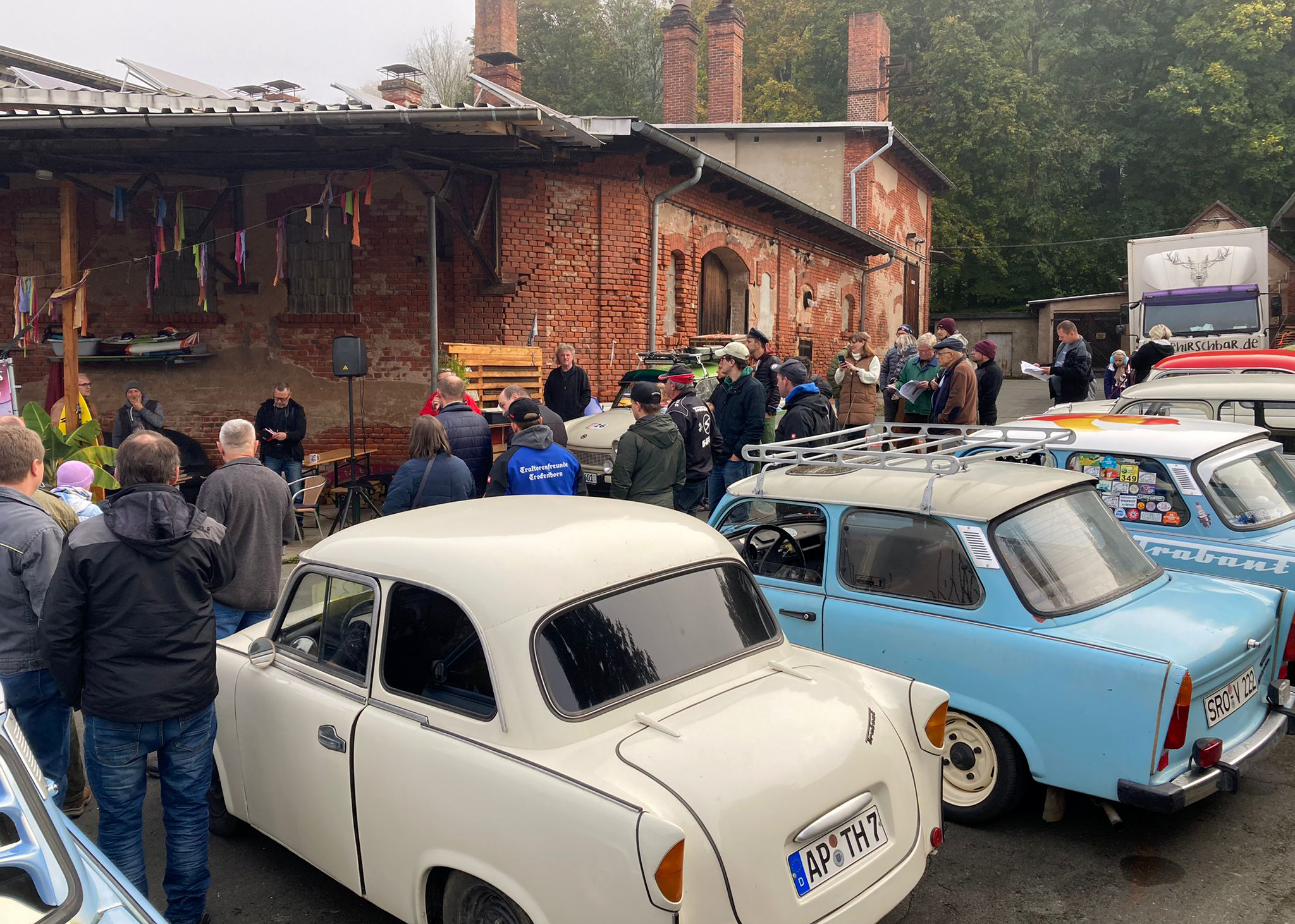 Dieter Meyer, Betreiber einer Trabi-Werkstatt und Vermietung, hatte Freunde um das DDR-Kult-Auto eingeladen, um auf einer Wertungsstrecke von 100 Kilometern, die eine oder andere Prüfung abzulegen.