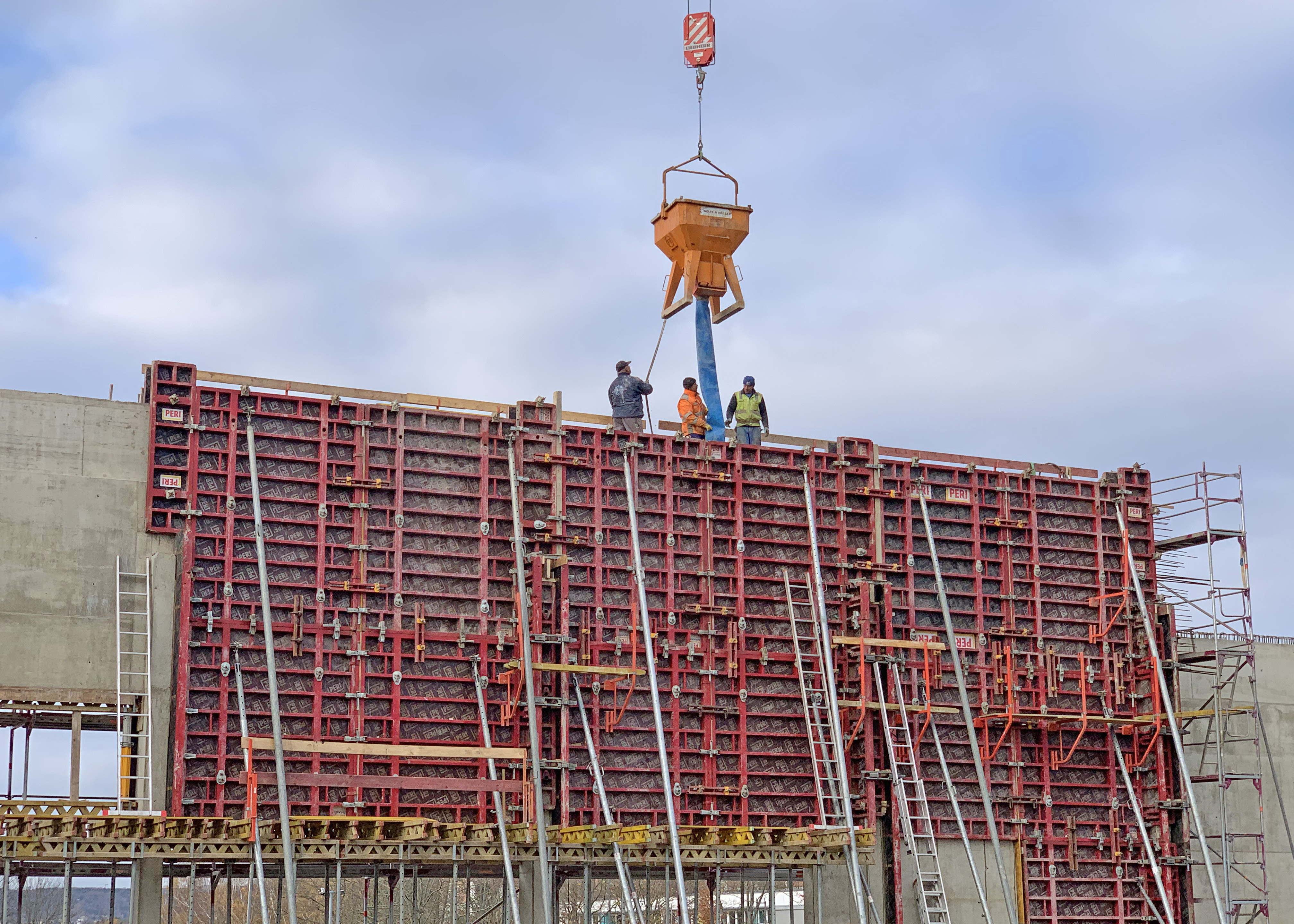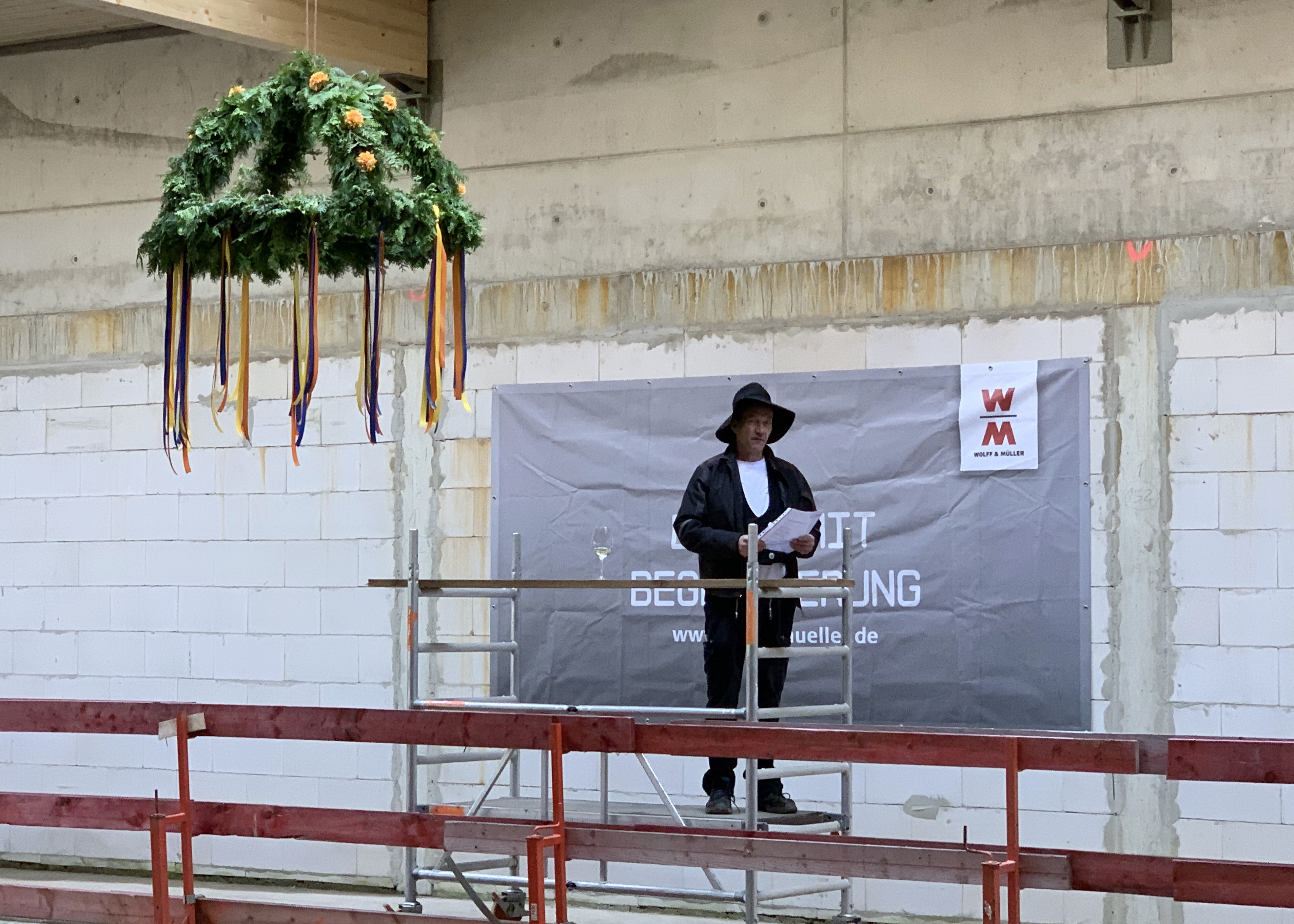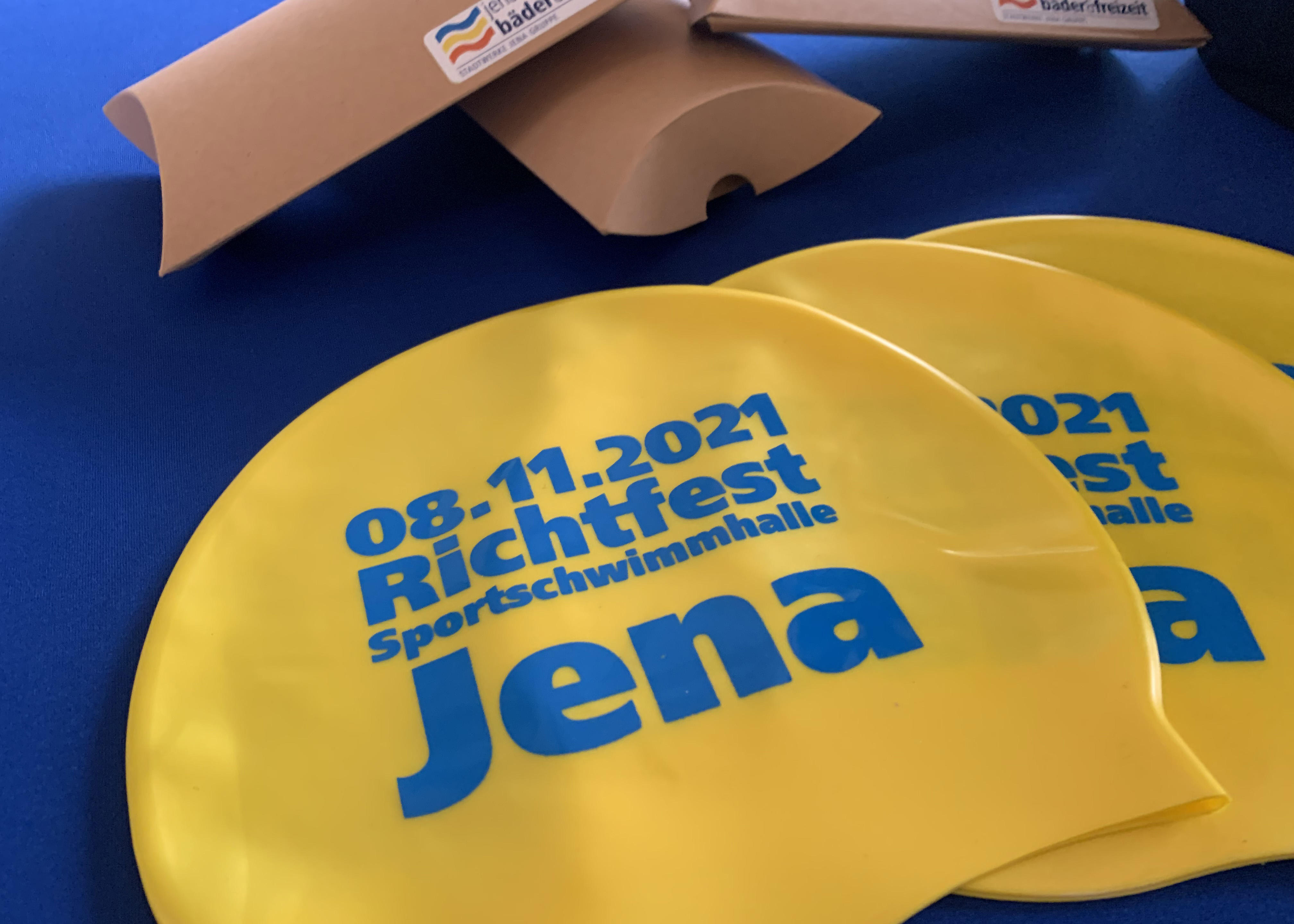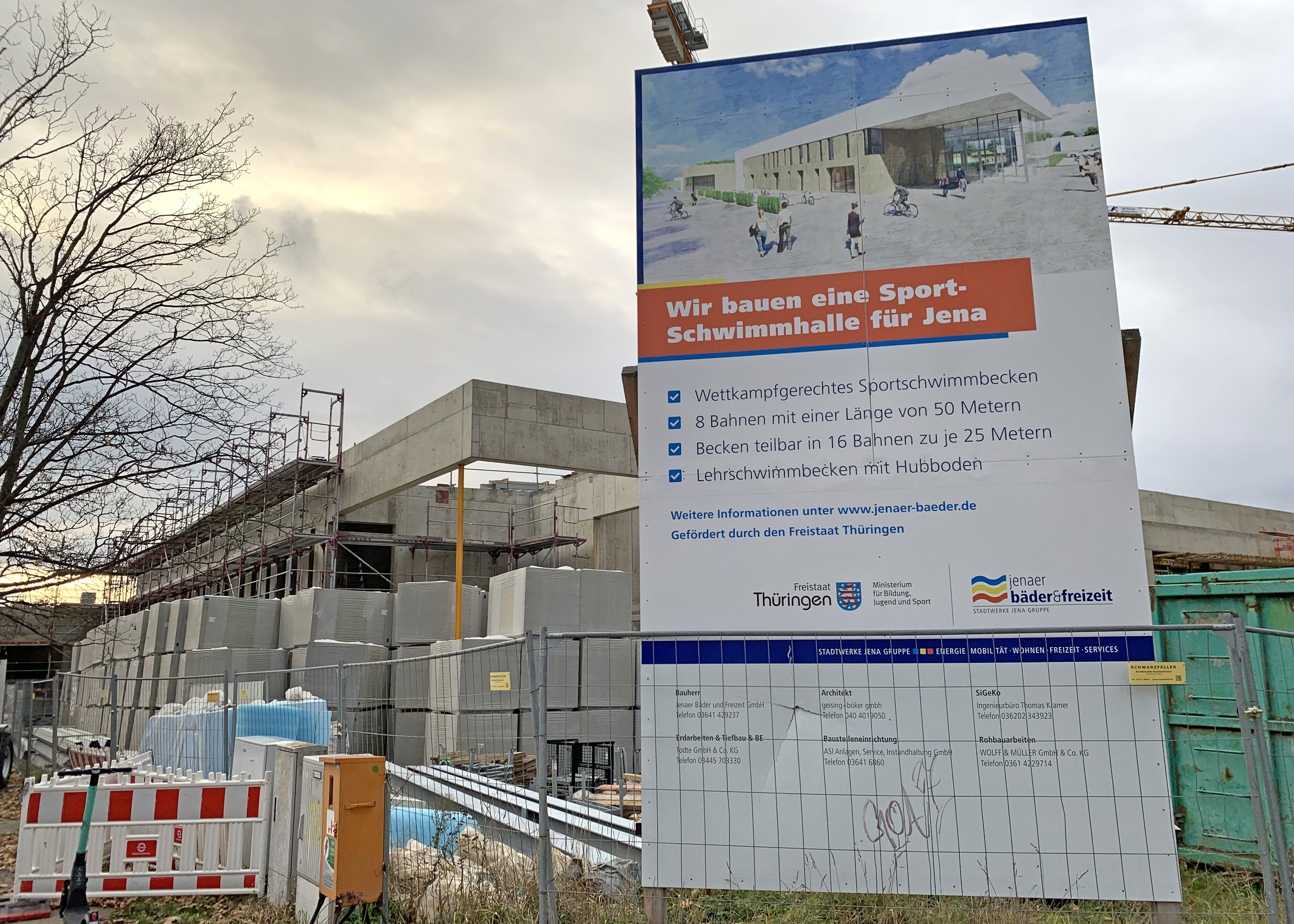 Ein Jahr nach Spatenstich war am Montagnachmittag Richtfest an der künftigen Sportschwimmhalle in Jena-Lobeda. Ende 2022 soll das Vorzeigeprojekt in Betrieb gehen. Fotos: Ben Baumgarten/JN
