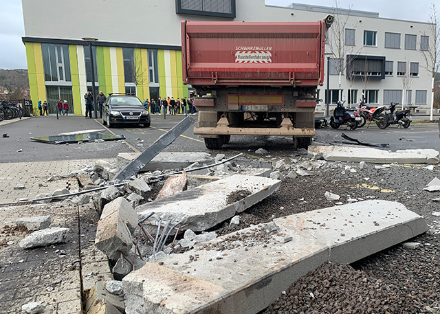 Laster mit Hänger kracht am Mittwochmittag ungebremst in Jenaer Schulhof. Schock bei Schülern und Lehrerschaft. Fotos: Ben Baumgarten/JN.