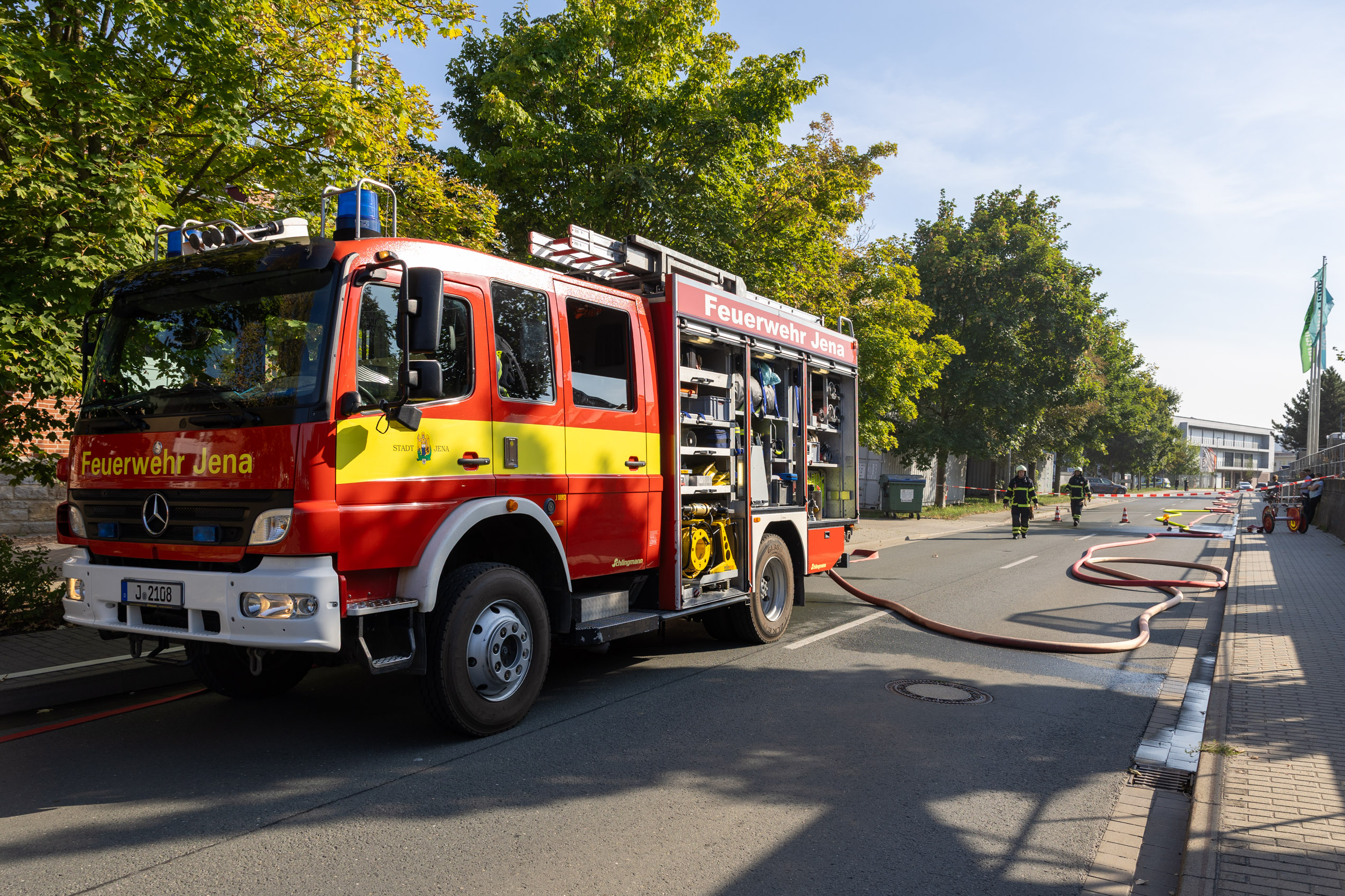 Feuerwehr-Großeinsatz in Jena: Brand in Gewerbeobjekt sorgt für Evakuierung und Straßensperrung.
