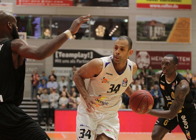 Duell der Aufsteiger: In einem Krimi gewinnt Science City Jena am Freitagabend denkbar knapp mit 91:90 (40:40) gegen Rasta Vechta. Nach zuletzt sechs Niederlagen in Serie wieder ein Erfolgserlebnis für die Saalestädter. Fotos: Michael Baumgarten