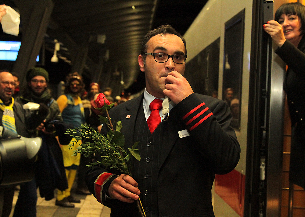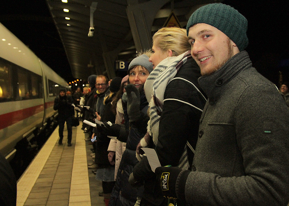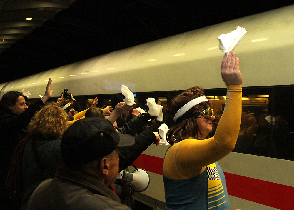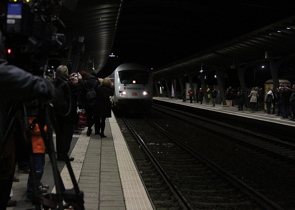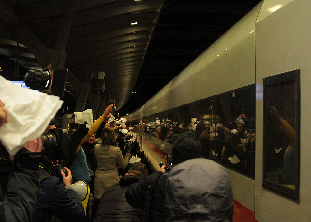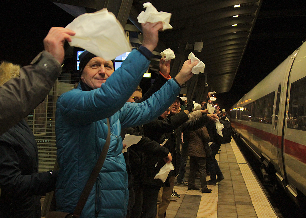 Winke, winke in Jena: Der letzte ICE auf dem Weg nach Berlin wurde am Samstagabend um 21:08 Uhr am Paradiesbahnhof von etwa 200 Jenaern verabschiedet. Unter ihnen Bundestags- und Landtagsabgeordnete, Stadträte, Vertreter der Universität und der Wirtschaft. Mit der Fahrplanumstellung am morgigen Tag, wird zukünftig nur noch einmal pro Tag ein ICE durch die Saalestadt fahren. Fotos: Michael Baumgarten