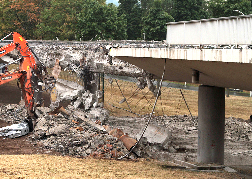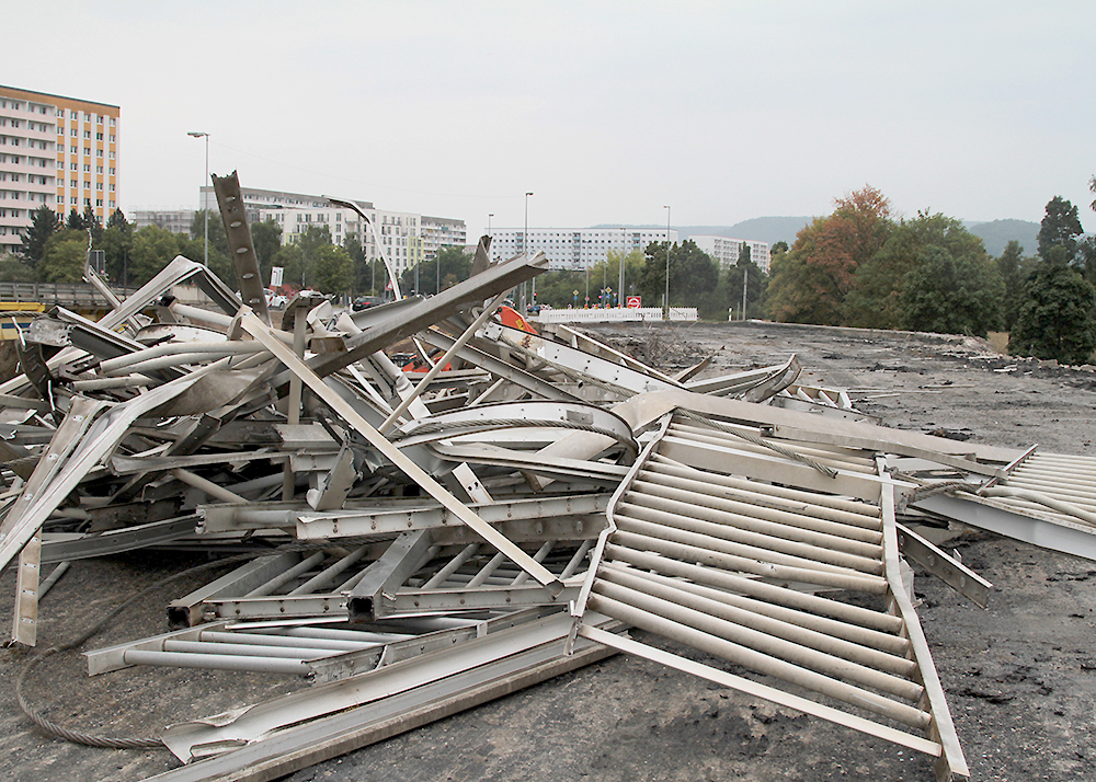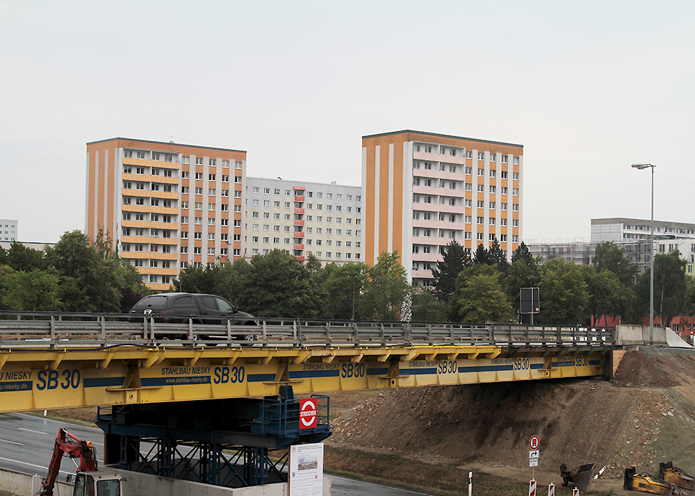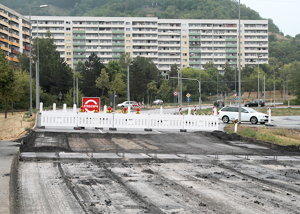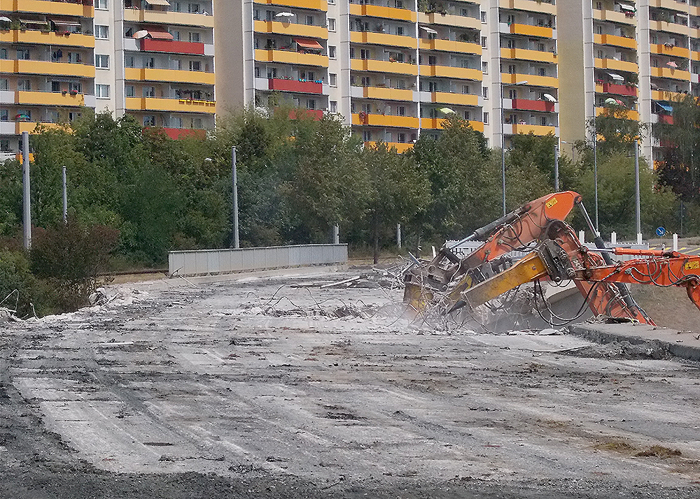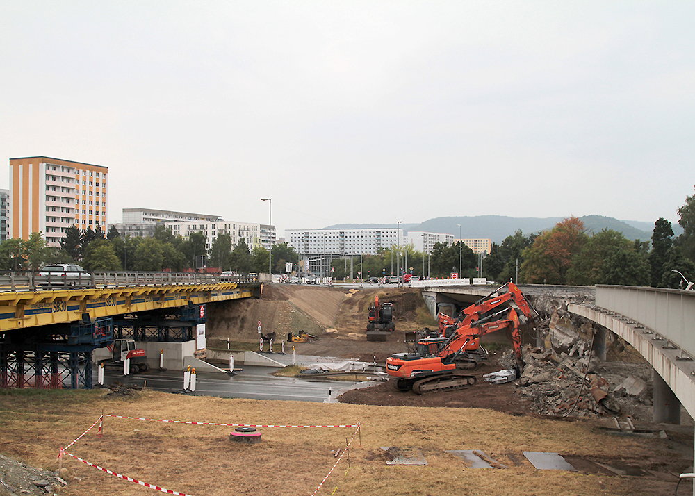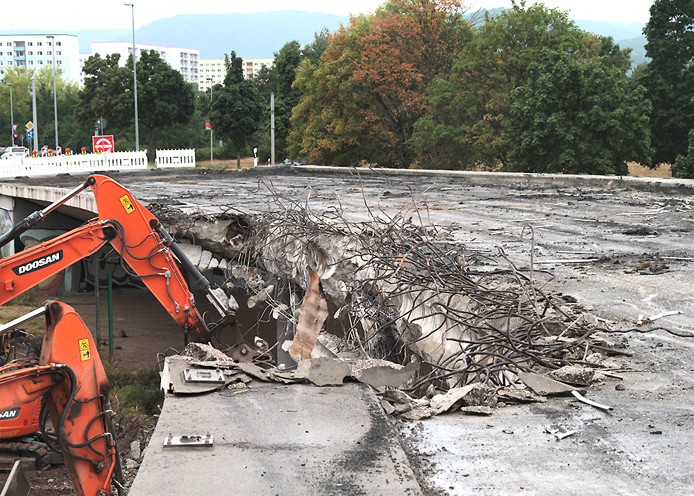 Der Abriss der Straßenbrücke in Jena zwischen Lobeda-Ost- und West ist in vollem Gange. Die Stadtrodaer Straße bleibt bis kommenden Sonntag voll gesperrt. Fotos: Andreas Wentzel