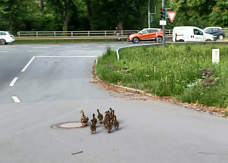 Jena. Entenfamilie auf Reisen: Herzergreifende Szene im Berufsverkehr in Jena.
