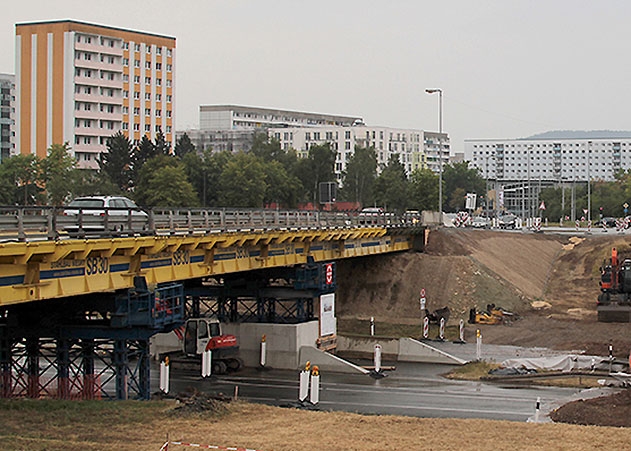 Jena. Das Traggerüst für die neue Brücke in Jena-Lobeda wird aufgebaut, dazu muss die Stadtrodaer Straße voll gesperrt werden.