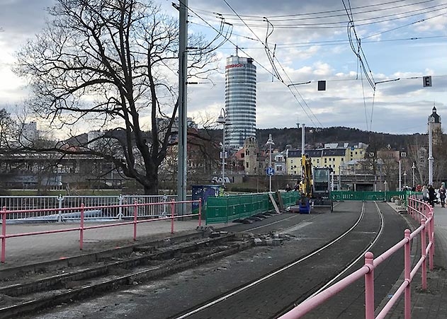 Jena. Wegen Gleisbauarbeiten an der Paradiesbrücke ist derzeit die Straßenbahnverbindung zwischen Jenas Innenstadt und Lobeda unterbrochen.