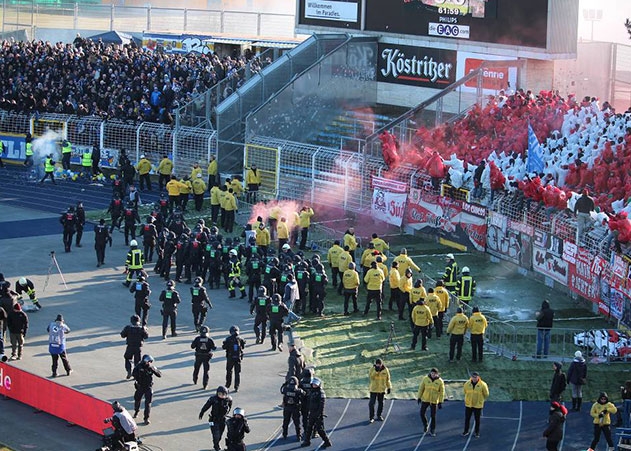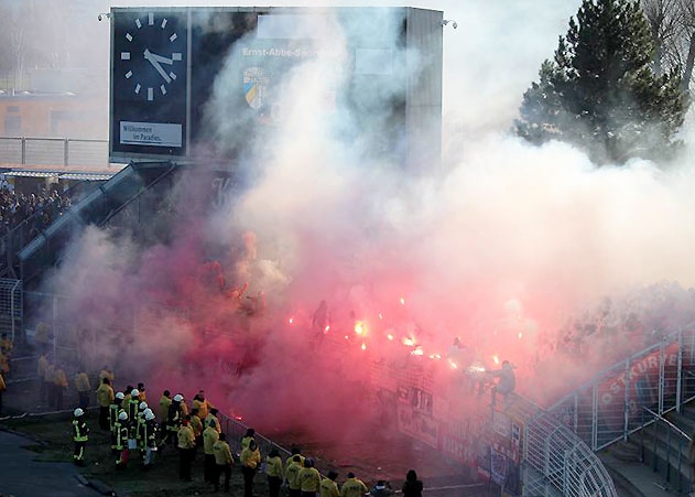 Jena. Mehrere Polizisten wurden beim Fußballspiel zwischen Jena und Erfurt am Sonntag von Zeiss Fans angegriffen.