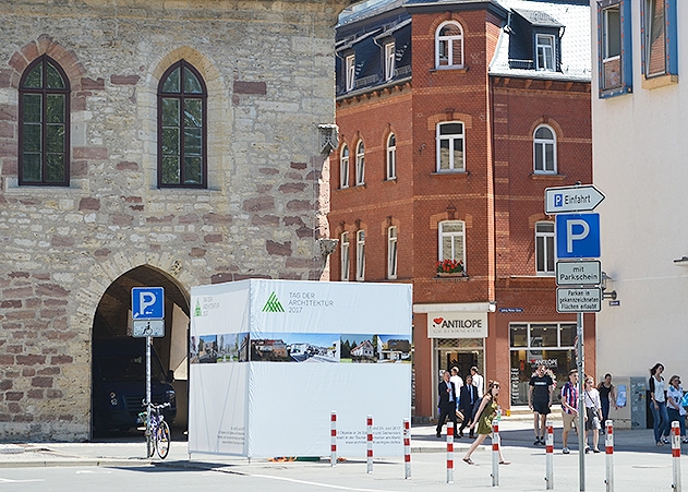 Jena. Ein drei Meter hoher Würfel in Jenas Innenstadt wirbt für den Besuch neuer Bauwerke zum Tag der Architektur am 24./25. Juni 2017.