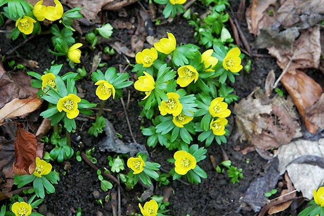 Jena. Gelbe Teppiche zwischen den Laubbäumen im Rautal. Kenner wissen: Der Winterling ist aufgegangen.