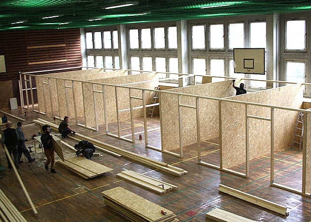 Jena. Die Turnhalle in der Schrödingerstraße in Winzerla wird gegenwärtig mit 15 Wohnabteilen für Flüchtlinge ausgerüstet.