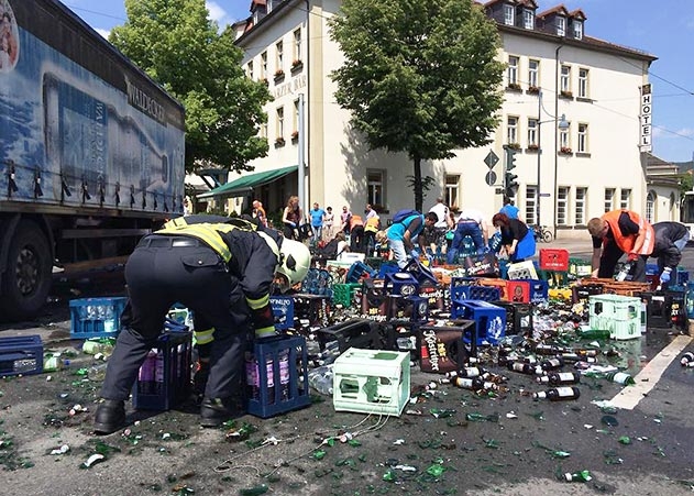 Jena. Lutherplatz wird zum Scherbenareal. Ein Getränketransporter hatte seine Ladung verloren.