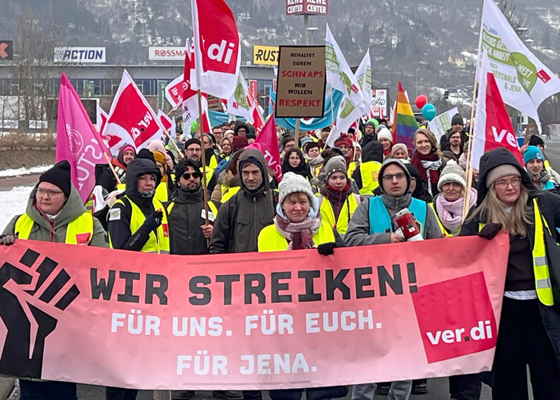 Jena. Rund 500 Beschäftigte legen die Arbeit nieder und demonstrieren in Jena für ihre Forderungen.