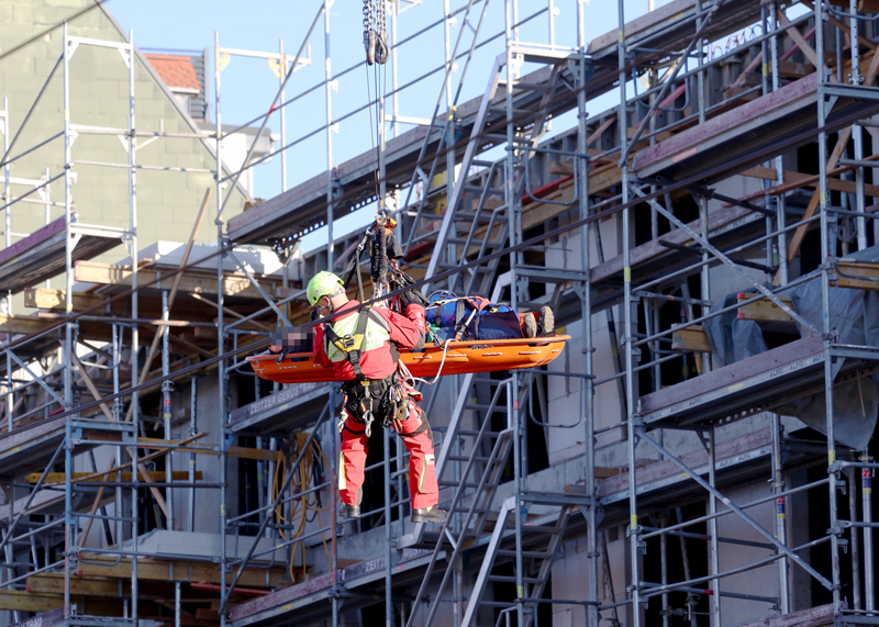 Jena. Feuerwehr holt in Jena schwer verletzten Bauarbeiter mit Kran vom Dach.