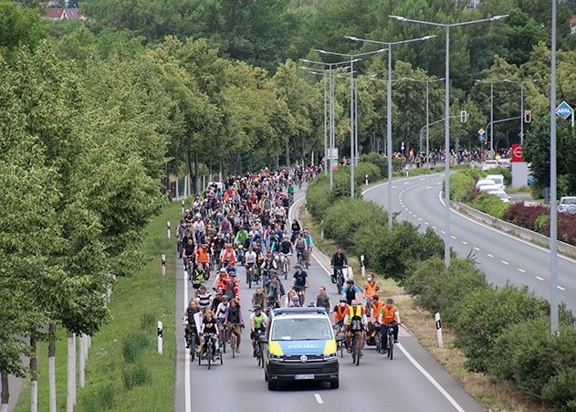 Jena. Am Dienstagabend radelten 400 Menschen nach Jena-Lobeda, um mehr Klimaschutz und bessere Radverkehrsnetze zu fordern.