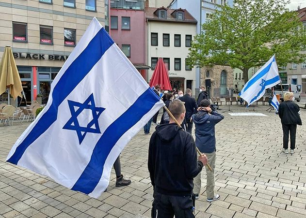 Jena. Gewalt in Nahost: Auf dem Holzmarkt in Jena protestierten am Montagabend rund 70 Teilnehmer gegen Antisemitismus.